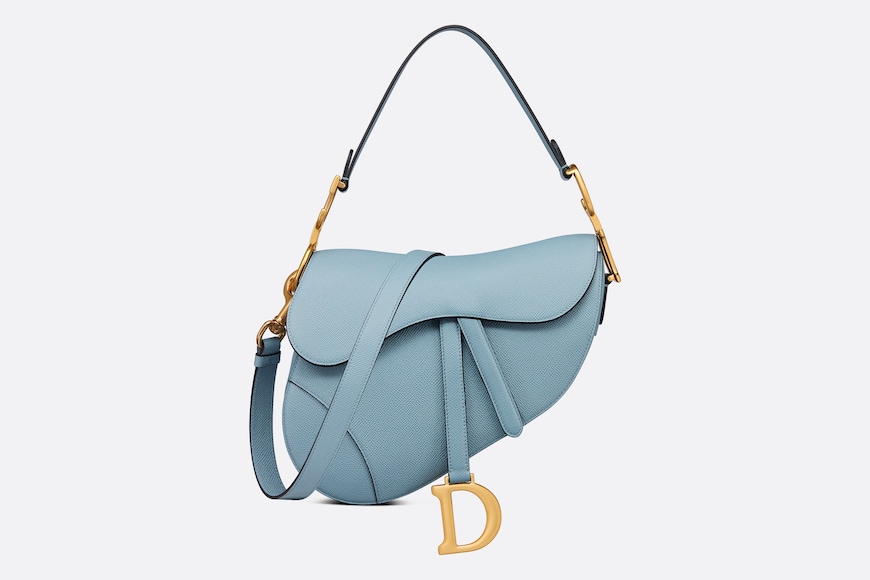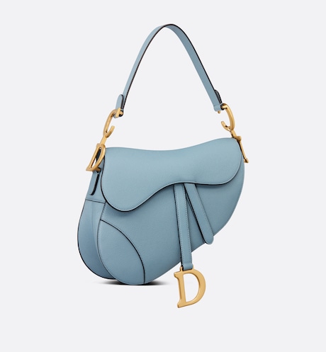 Maria Grazia Chiuri brings a fresh update to the iconic Saddle bag. Crafted in horizon blue grained calfskin, the legendary design presents a Saddle flap with a magnetic D stirrup clasp, as well as an antique gold-finish metal CD signature on either side of the strap. Featuring a thin, adjustable and removable shoulder strap, the Saddle bag may be carried by hand, worn over the shoulder or crossbody.