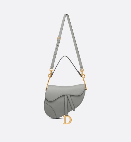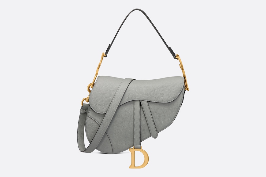 Maria Grazia Chiuri brings a fresh update to the iconic Saddle bag. Crafted in gray grained calfskin, the legendary design presents a Saddle flap with a magnetic D stirrup clasp, as well as an antique gold-finish metal CD signature on either side of the strap. Featuring a thin, adjustable and removable shoulder strap, the Saddle bag may be carried by hand, worn over the shoulder or crossbody.