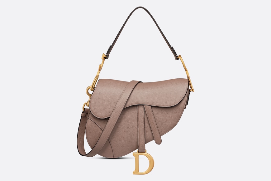 Maria Grazia Chiuri brings a fresh update to the iconic Saddle bag. Crafted in warm taupe grained calfskin, the legendary design presents a Saddle flap with a magnetic D stirrup clasp, as well as an antique gold-finish metal CD signature on either side of the strap. Featuring a thin, adjustable and removable shoulder strap, the Saddle bag may be carried by hand, worn over the shoulder or crossbody.