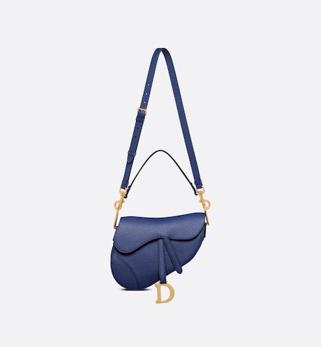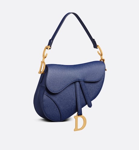 Maria Grazia Chiuri brings a fresh update to the iconic Saddle bag. Crafted in royal blue grained calfskin, the legendary design features a Saddle flap with a magnetic D stirrup clasp, as well as an antique gold-finish metal CD signature on either side of the strap. Equipped with a thin, adjustable and removable strap, the Saddle bag may be carried by hand, worn over the shoulder or crossbody.