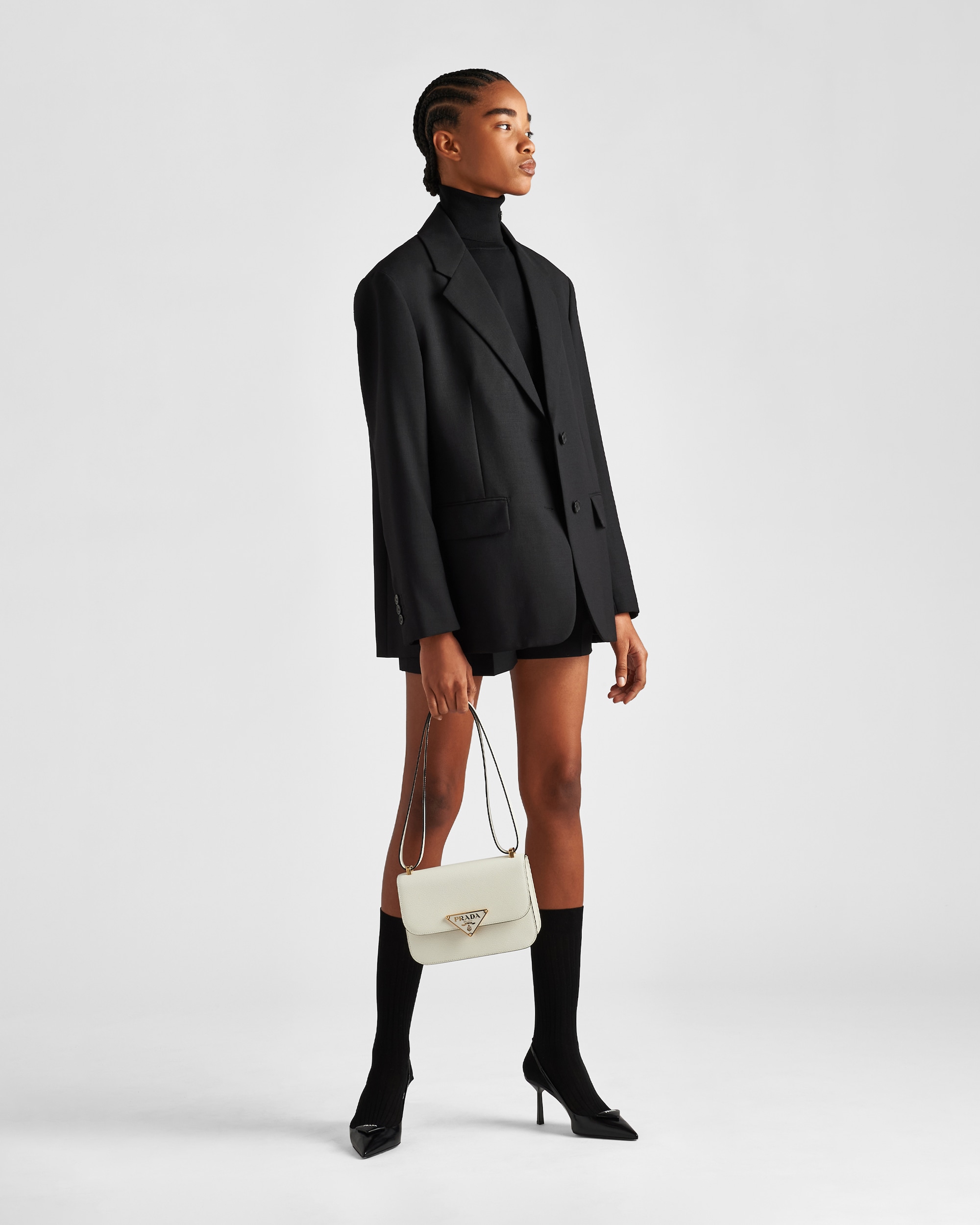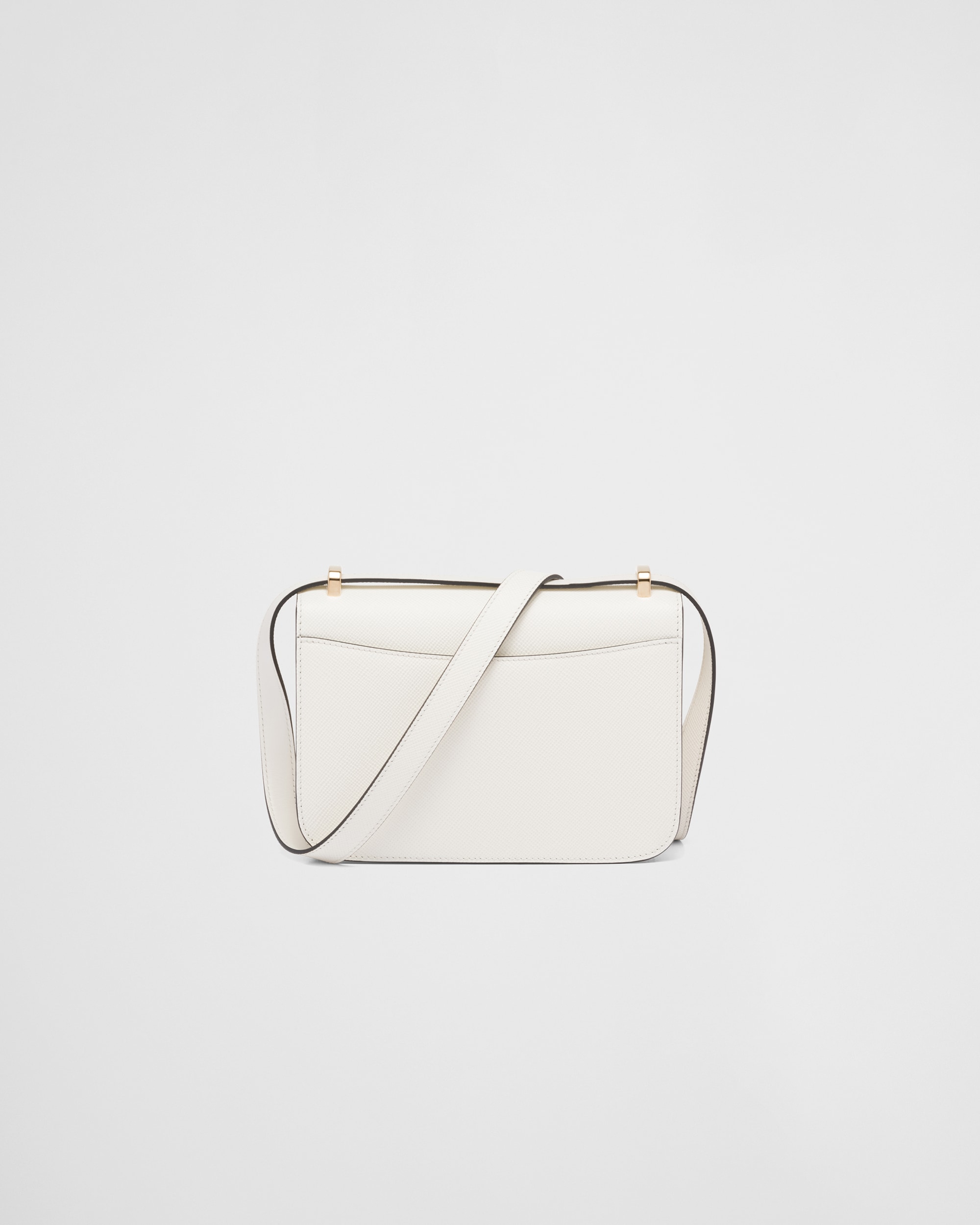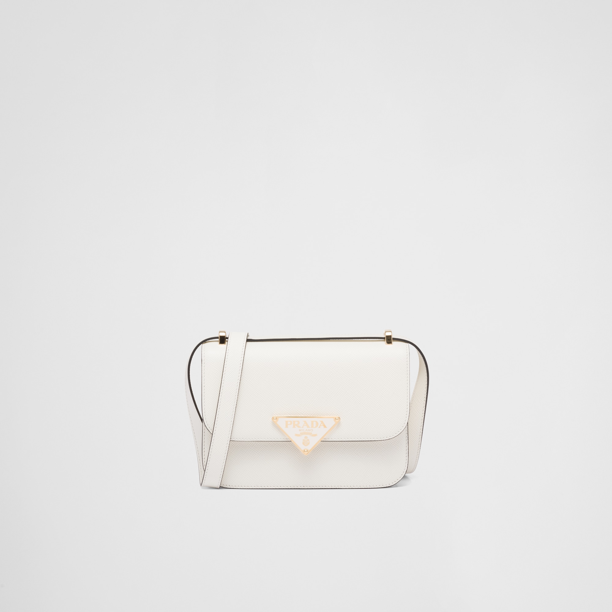 This shoulder bag with a structured classic design is made of Saffiano leather, an iconic material of the brand characterized by its crosshatch texture and waxed finish. The triangle logo, first introduced by Mario Prada on the trunks he designed, decorates the front. Provided with a handle with a novel design, the accessory comes with an adjustable shoulder strap to be worn in different ways.