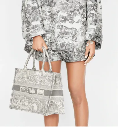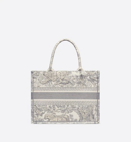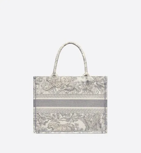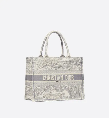 The Dior Book Tote is an original creation introduced by Dior's Creative Director, Maria Grazia Chiuri, and has become a staple of the Dior aesthetic. Designed to hold all the daily essentials, it is fully embroidered with a gray Toile de Jouy motif and adorned with a 'CHRISTIAN DIOR' signature on the front. The small tote exemplifies the House's signature savoir-faire and may be carried by hand or worn over the shoulder.