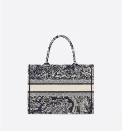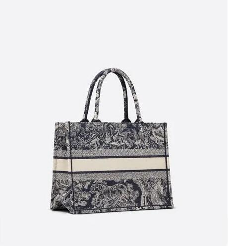 Introduced by Maria Grazia Chiuri, Creative Director of Christian Dior, the Dior Book Tote has become a staple of the Dior aesthetic. Designed to hold all small daily essentials, the style has been fully embroidered with a blue Toile de Jouy Reverse motif, a variation of the House's hallmark pattern with a play on reversed colors. Adorned with the 'CHRISTIAN DIOR' signature on the front, the small tote exemplifies the House's signature savoir-faire and may be carried by hand or worn over the shoulder.
