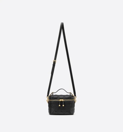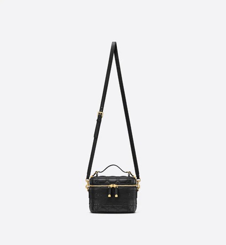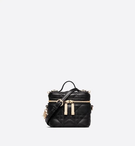 The DiorTravel vanity case is crafted in black supple lambskin, enhanced by Cannage topstitching and a band embossed with the 'CHRISTIAN DIOR' signature. The design can accommodate a phone, a wallet, a case for AirPods and a notebook. The small accessory is an ideal daily companion and can be carried by hand, worn over the shoulder or crossbody thanks to its handle and removable shoulder strap.