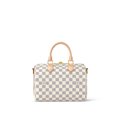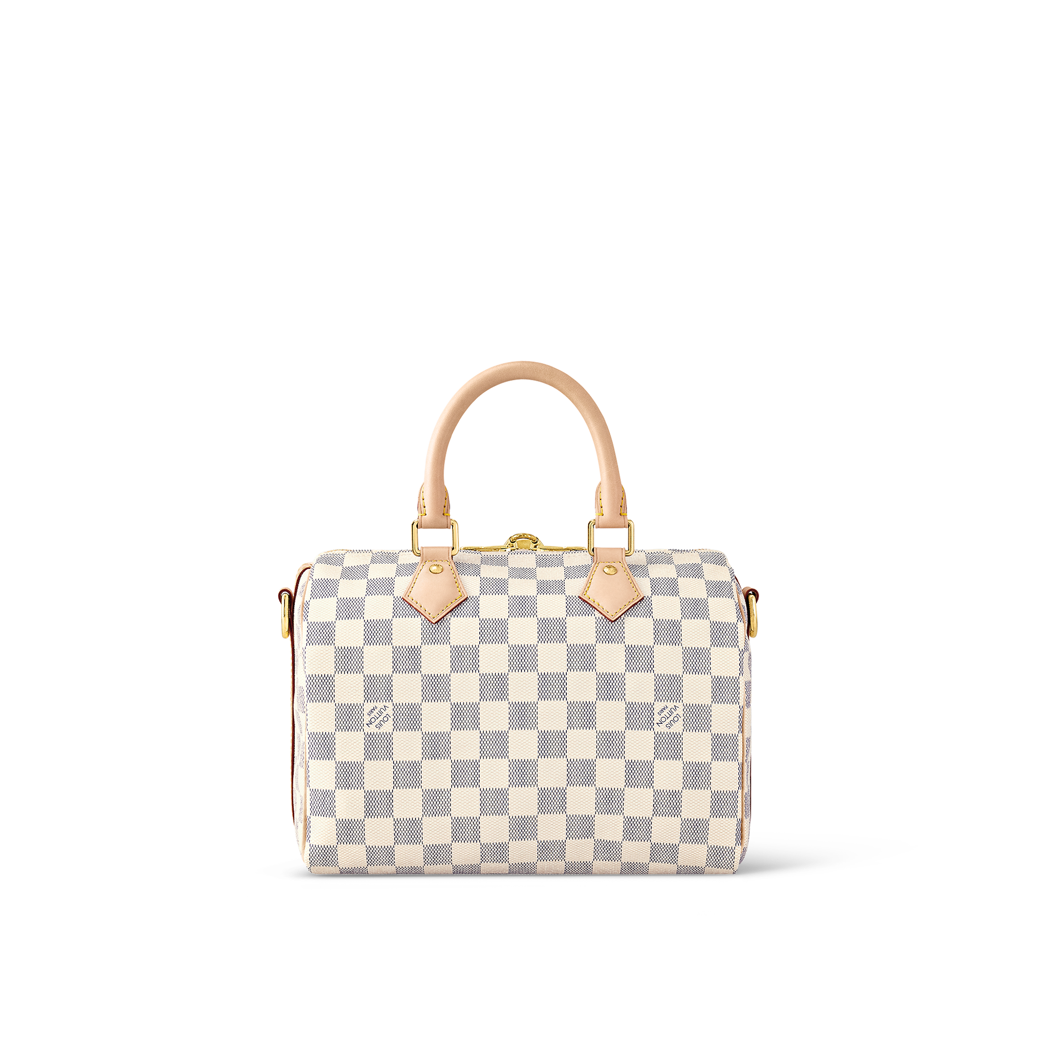 The Speedy Bandoulière 25 handbag in fresh Damier Azur canvas is an ideal choice for summer in the city. Originally created for travelers in the 1930s – the name refers to the era's rapid transit – every feature of the Speedy's design is iconic, from its unmistakable shape to the rolled leather handles, engraved padlock and detachable strap.
