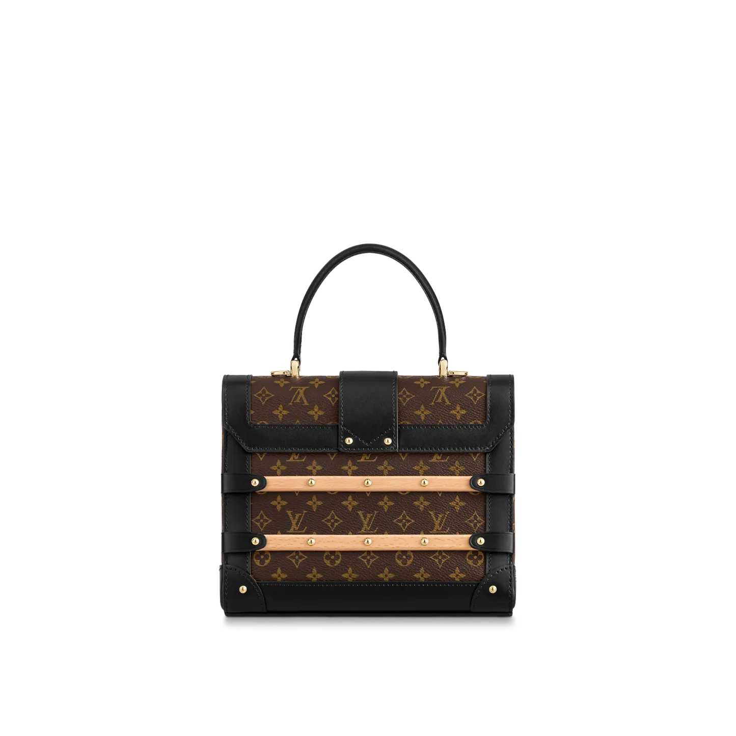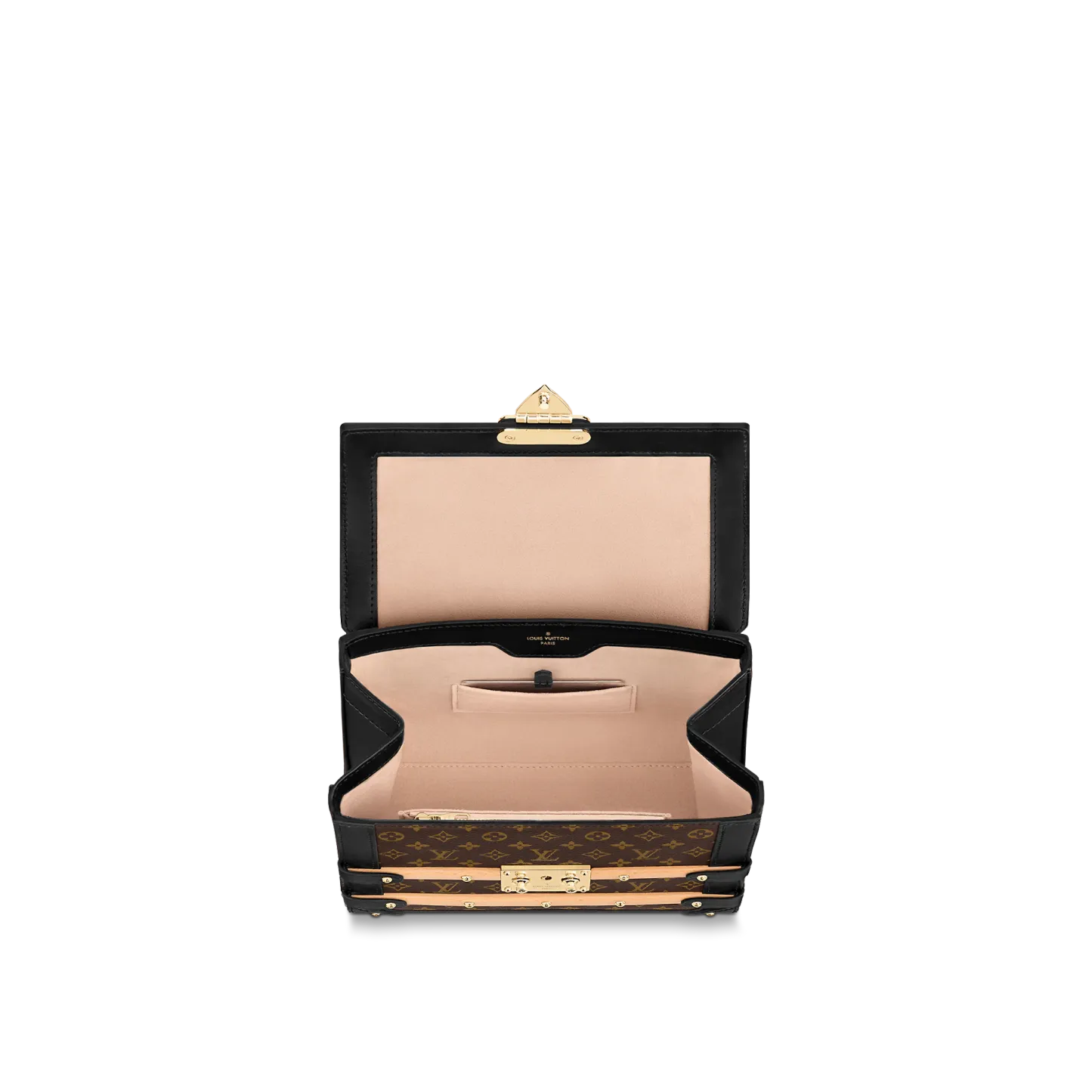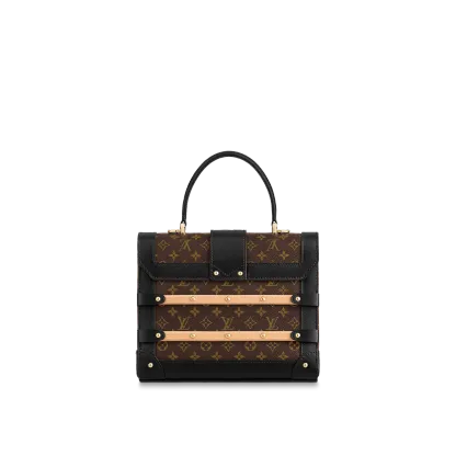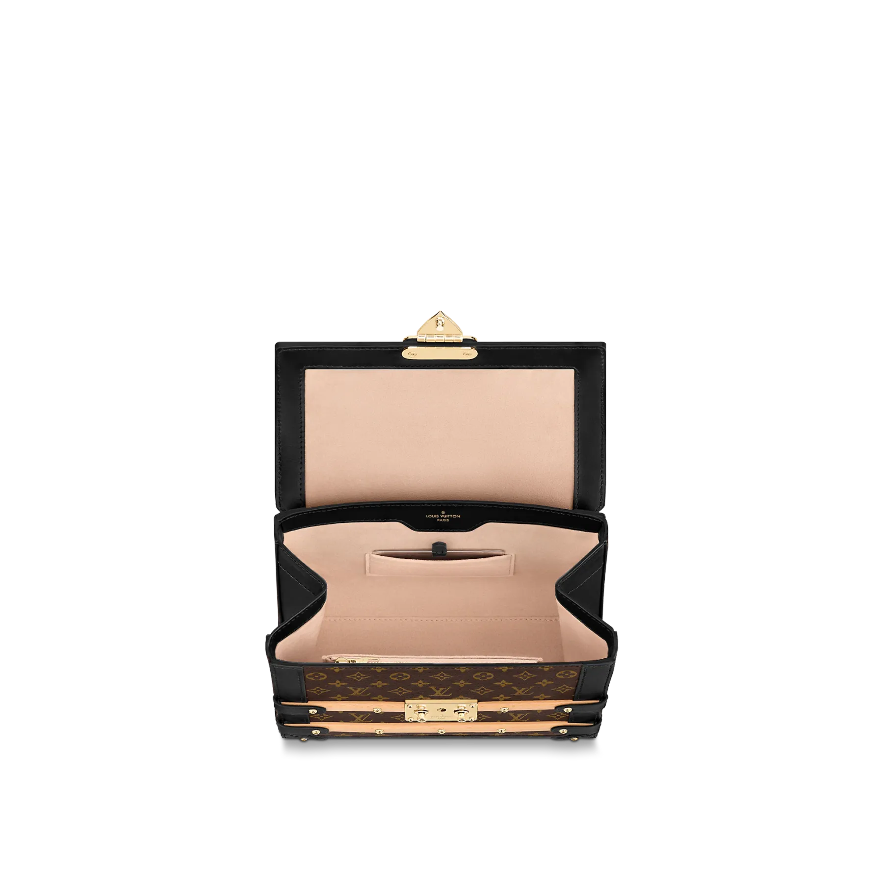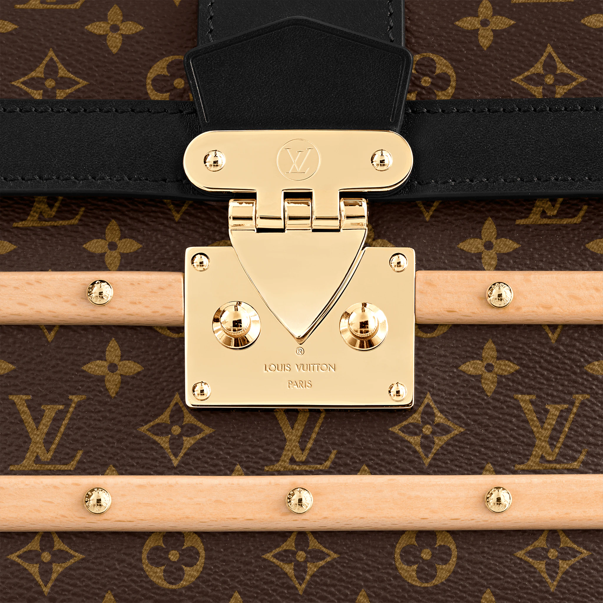 Nicolas Ghesquière looks back at Louis Vuitton's box-making history and creates Trianon small handbags. Monogram canvas shapes a semi-rigid design. S-lock hooks, leather and wooden trim continue the traditional hard box elements. The top handle and the detachable and adjustable leather shoulder strap realize the choice of shoulder and crossbody.