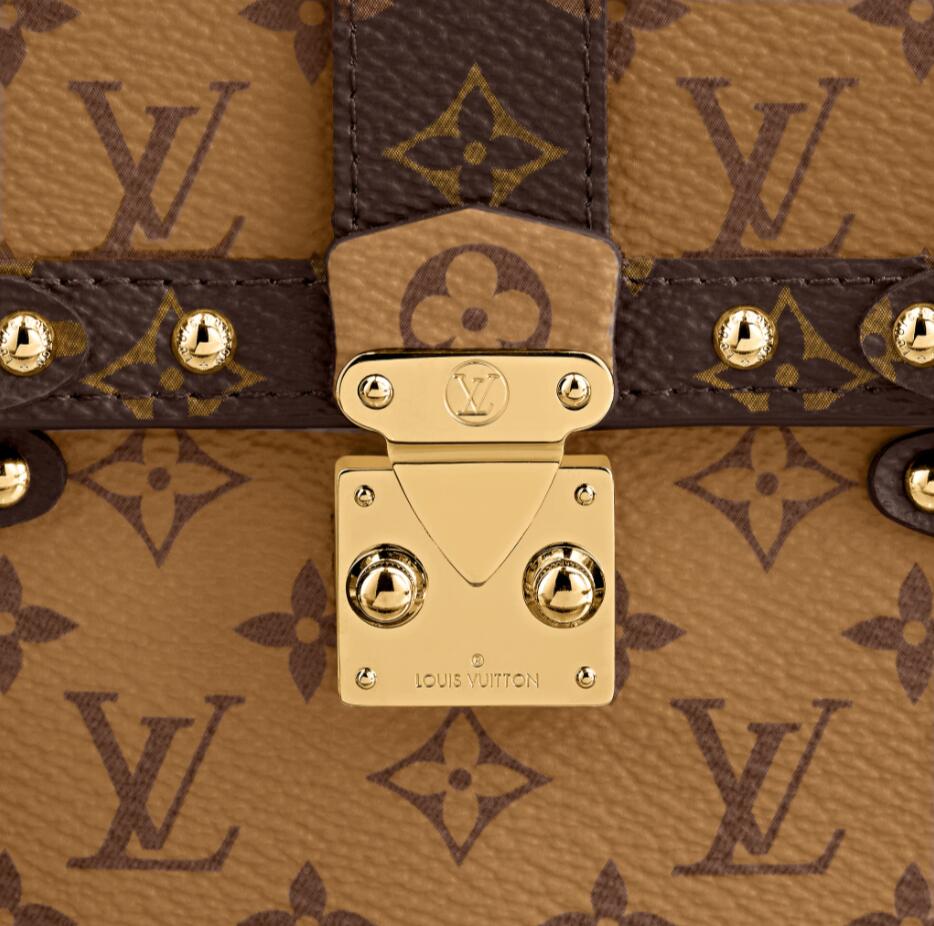 The Pochette Trunk Verticale is made from Monogram Reverse canvas with Monogram canvas trim and classic trunk details like the S-lock and malletage quilted interior. The adjustable strap is also removable to make this pouch a hand carried clutch or a mini bag worn crossbody. It easily holds two phones and a few cards.