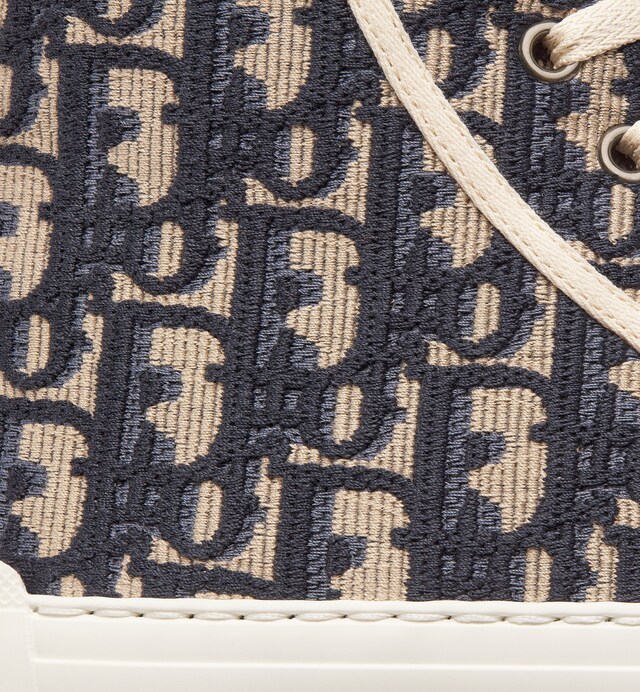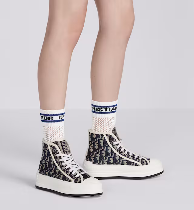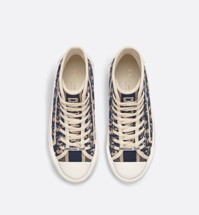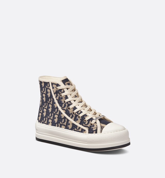 The Walk'n'Dior platform sneaker enhances the line with a modern creation. The high-top upper in deep blue Dior Oblique embroidered cotton reveals a comfortable thick sole, tongue and Christian Dior Paris laces. The sneaker will add a contemporary touch to any laid-back look.