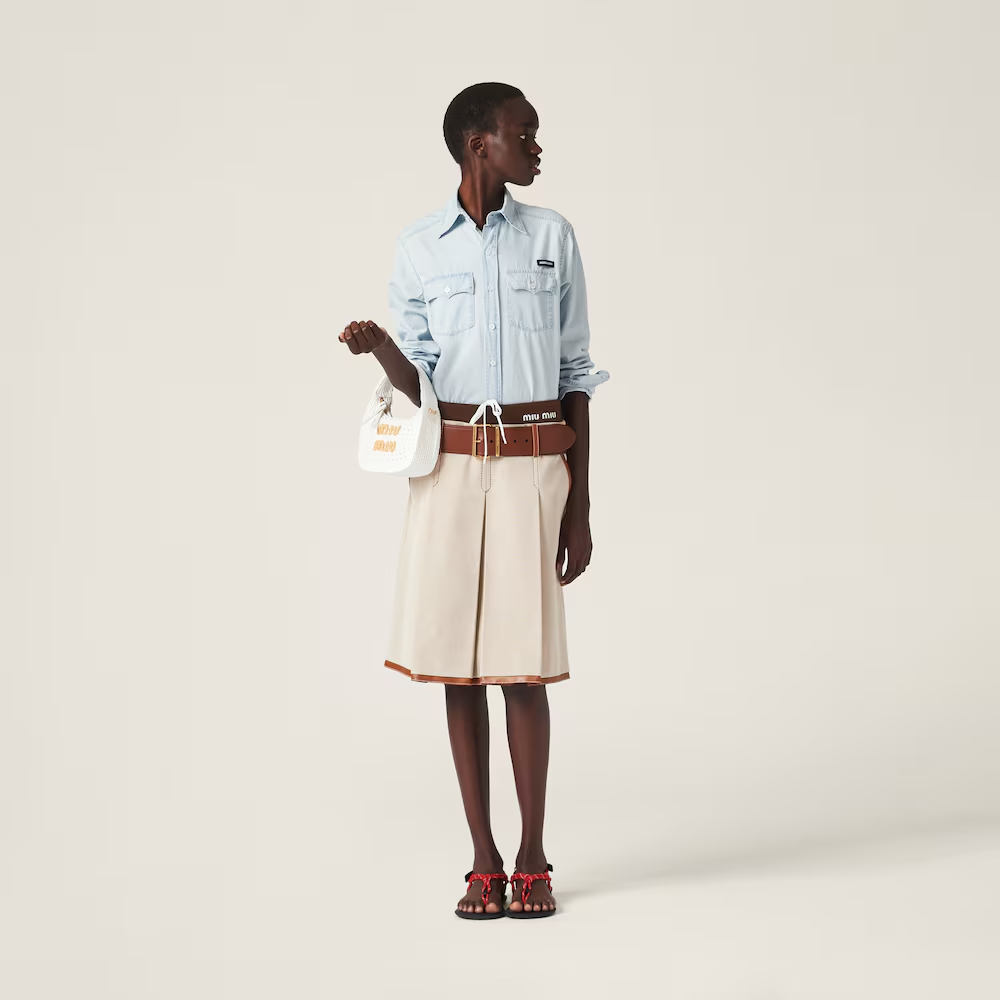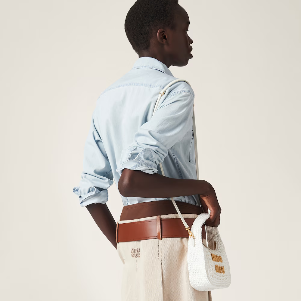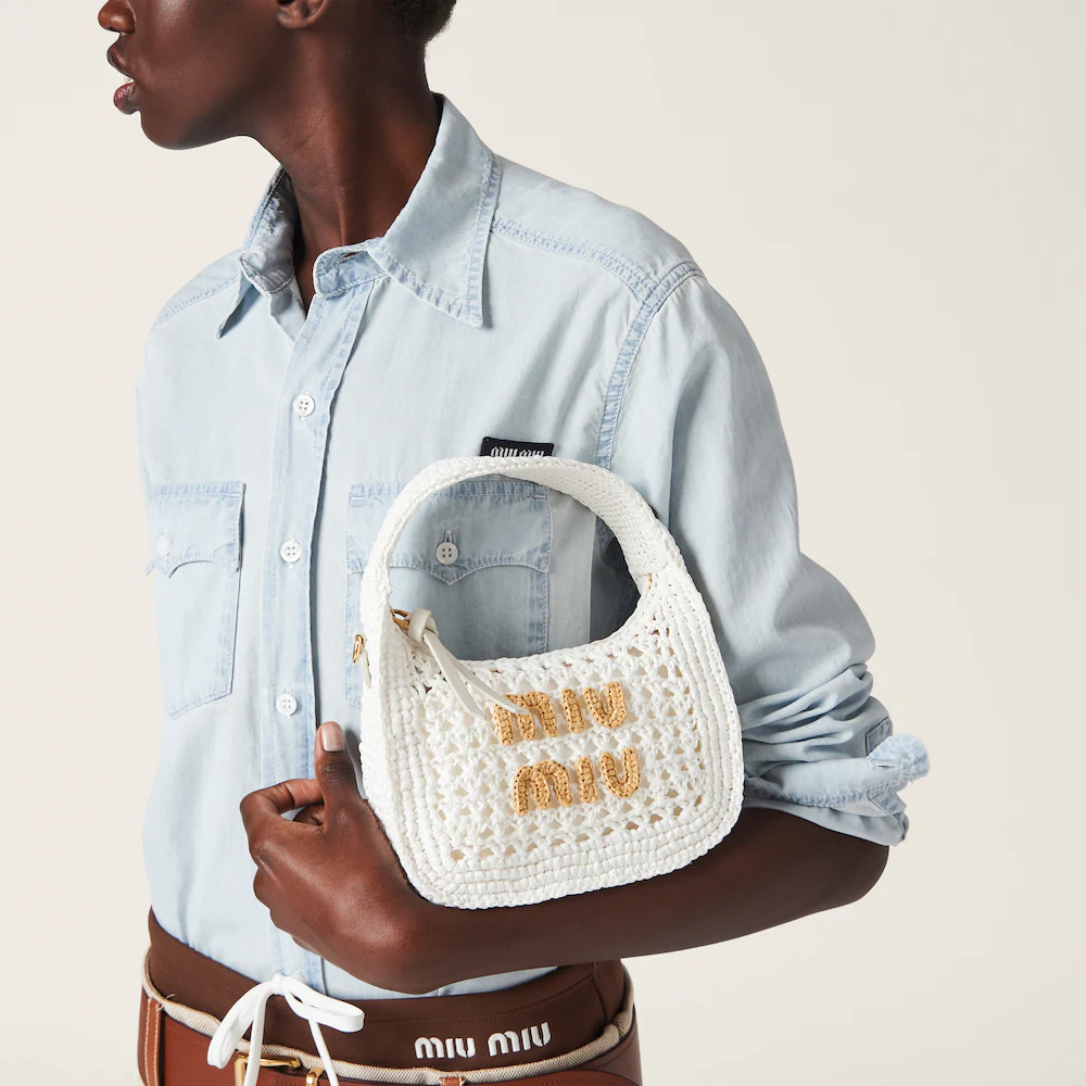 The Wander bag is reinterpreted, season after season, becoming an iconic accessory of Miu Miu collections. This version made of woven fabric expresses a refined, sophisticated style with a retro mood. The stylized logo in a contrasting color completes the design with an iconic note.