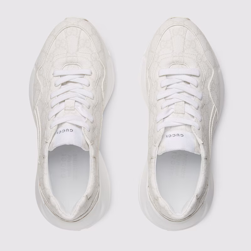 A reference to retro sportswear, the Rhyton sneaker stands out for its chunky silhouette and oversize sole. A new iteration, imagined for the Gucci Love Parade collection, the shoe is crafted from white GG Supreme canvas. The emblematic material gives the style a strong logo feel, playing with the vintage influences to create a link to the '90s logo trend.