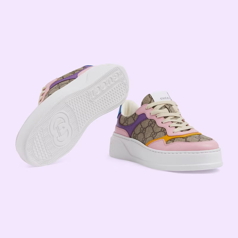Pastel colors add a playful note to the collection, adding a retro aesthetic to classic silhouettes. This pair of chunky sneakers is presented in a mix of different materials with an Interlocking G print at the back. An emblematic material, beige and ebony GG Supreme canvas is framed by multicolor leather.