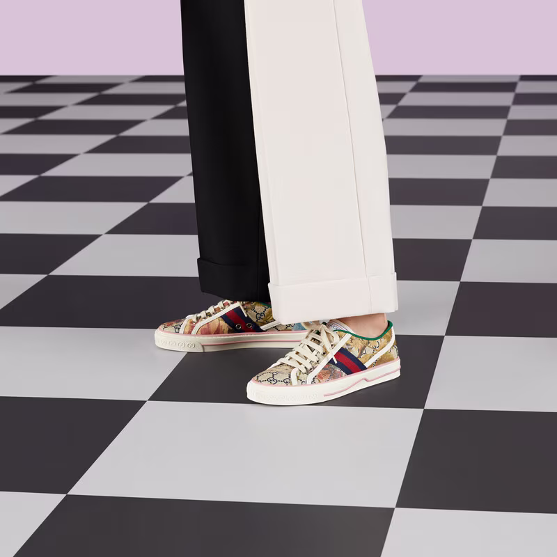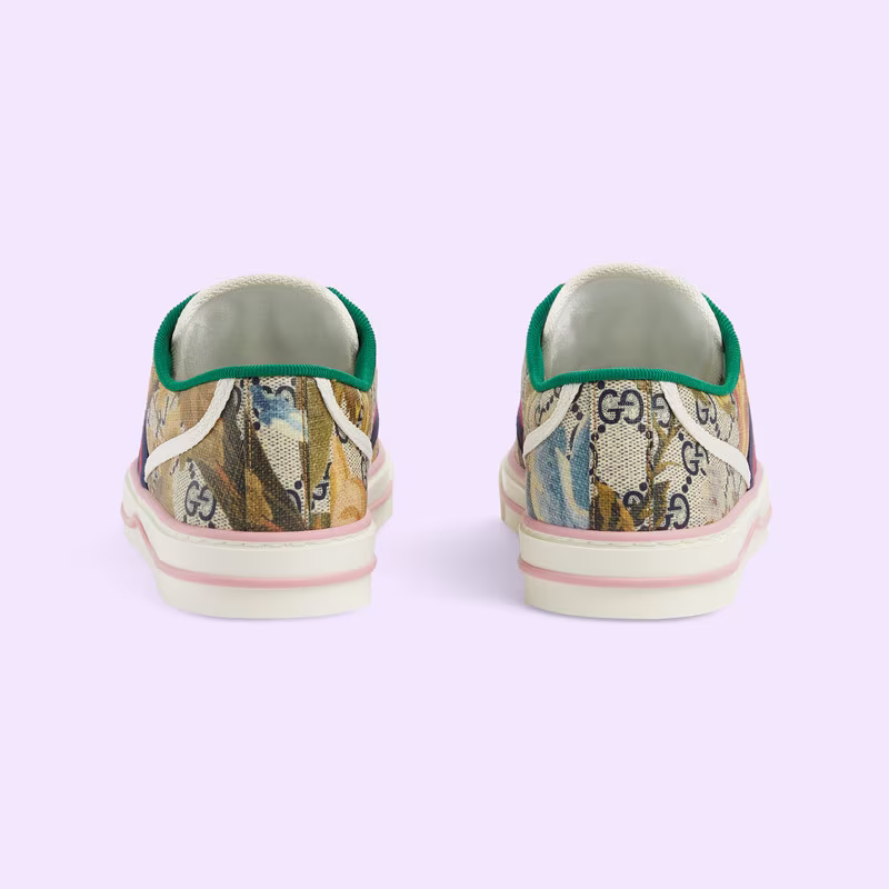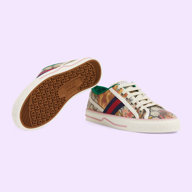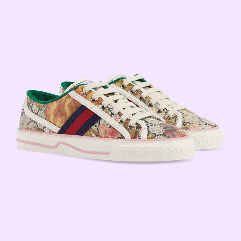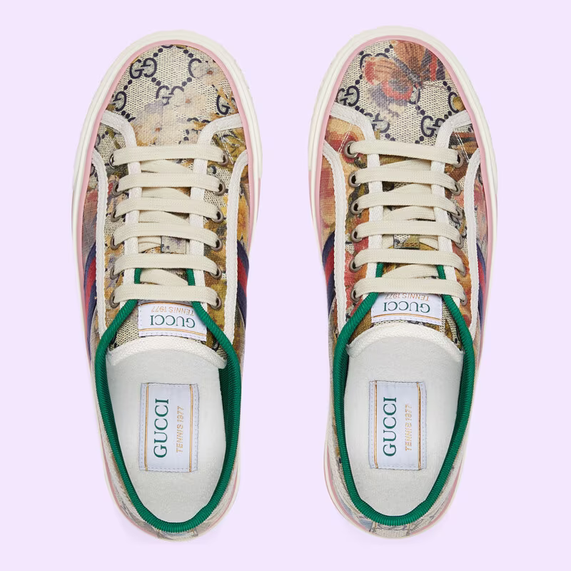 The historical Flora motif from the 1960s was designed by artist Vittorio Accornero. The floral pattern enriches this pair of sneakers with a romantic nature, appearing as a multicolored print atop the GG motif.