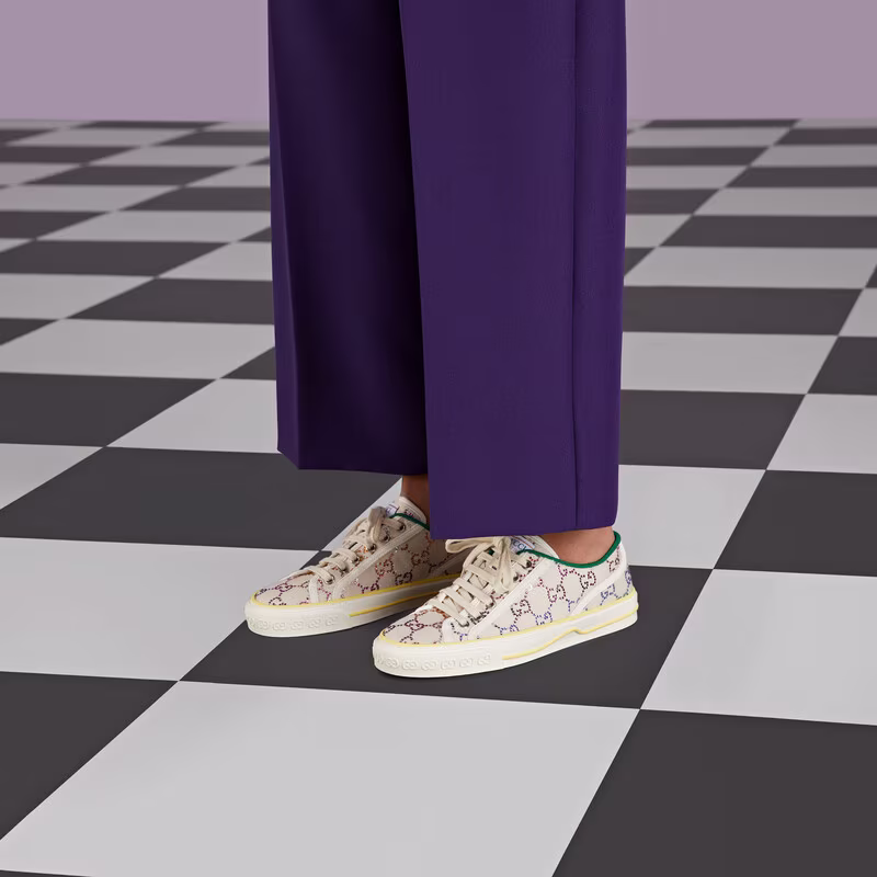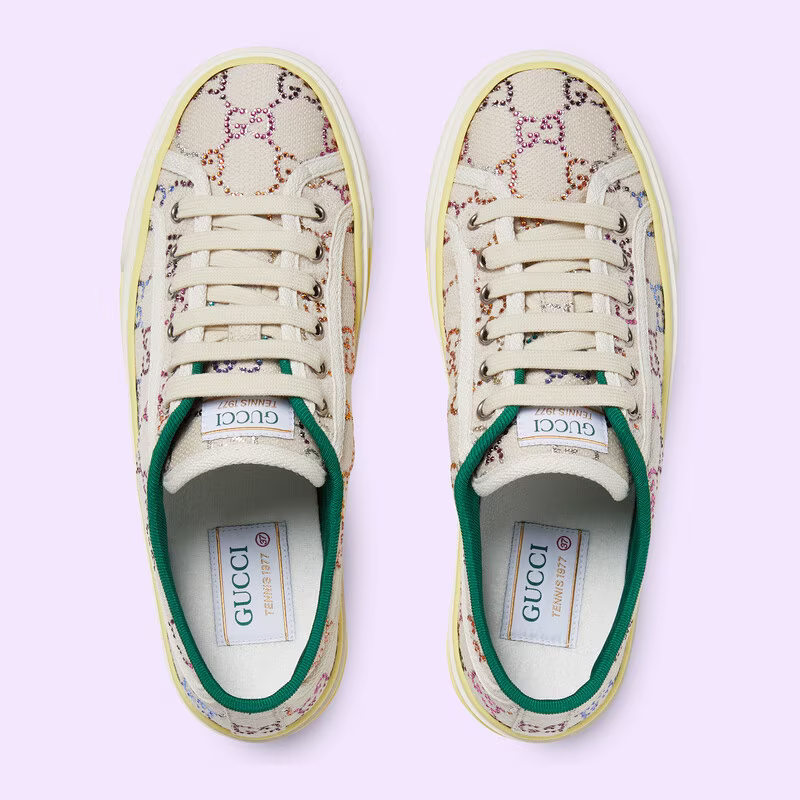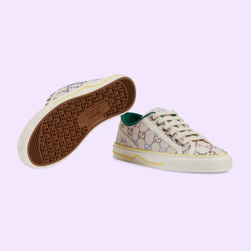A variation on a classic, this Gucci Tennis 1977 sneaker is presented in GG lamé canvas. The Cruise 2023 Gucci Cosmogonie collection explores the archives, adding contemporary touches to vintage styles as a tribute to both the brand's past, present and future.