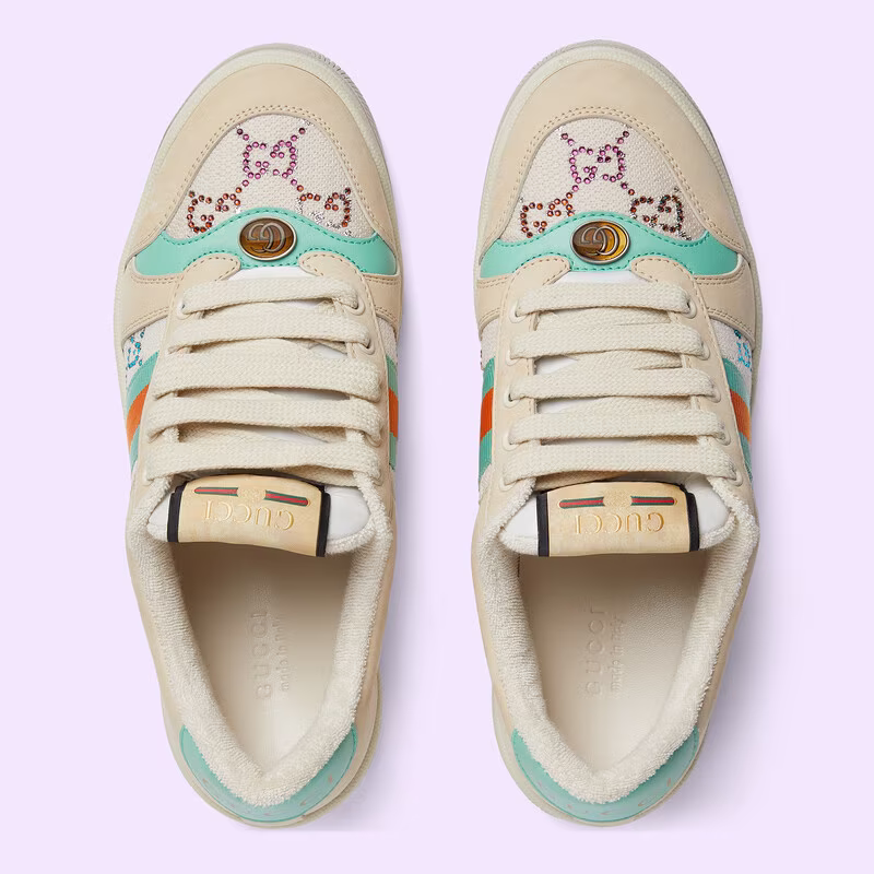 Influenced by classic trainers from the '70s, the Screener sneakers—named for the defensive sports move—feature the Web stripe on the side and the vintage Gucci logo. Here the style is reimagined in crystal defined GG fabric, with vintage green leather details.